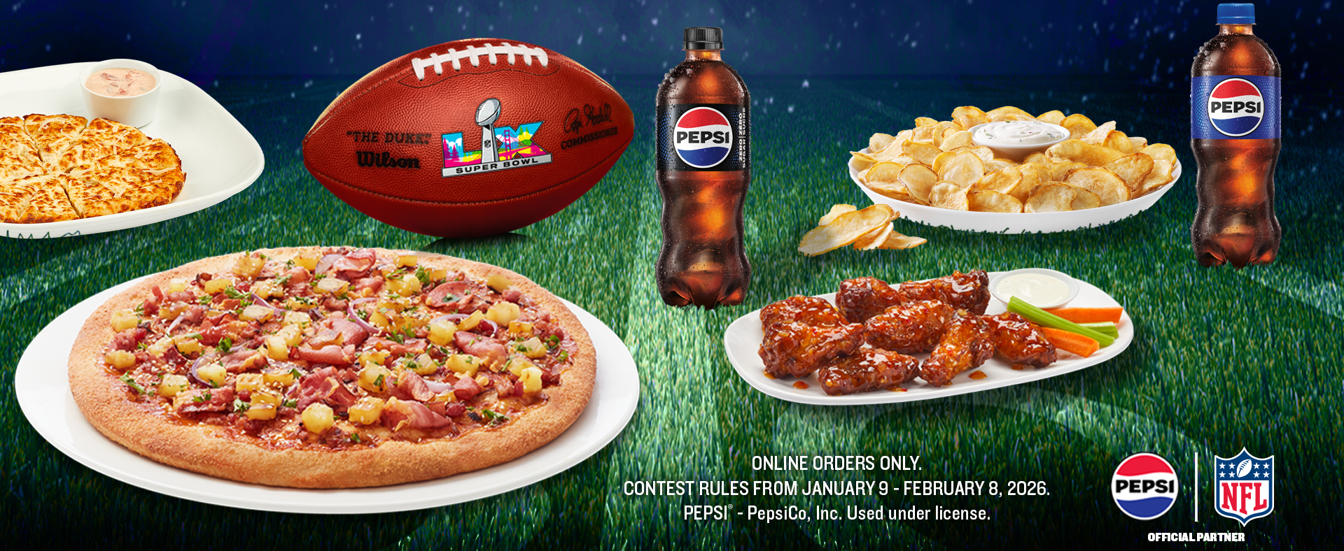 Whether it's a single can, bottle or pack of Pepsi® products, you will be automatically entered into the contest. All you need to do is browse our menu, add your favourite Pepsi® product to your Game Day online order, checkout and enjoy your meal!